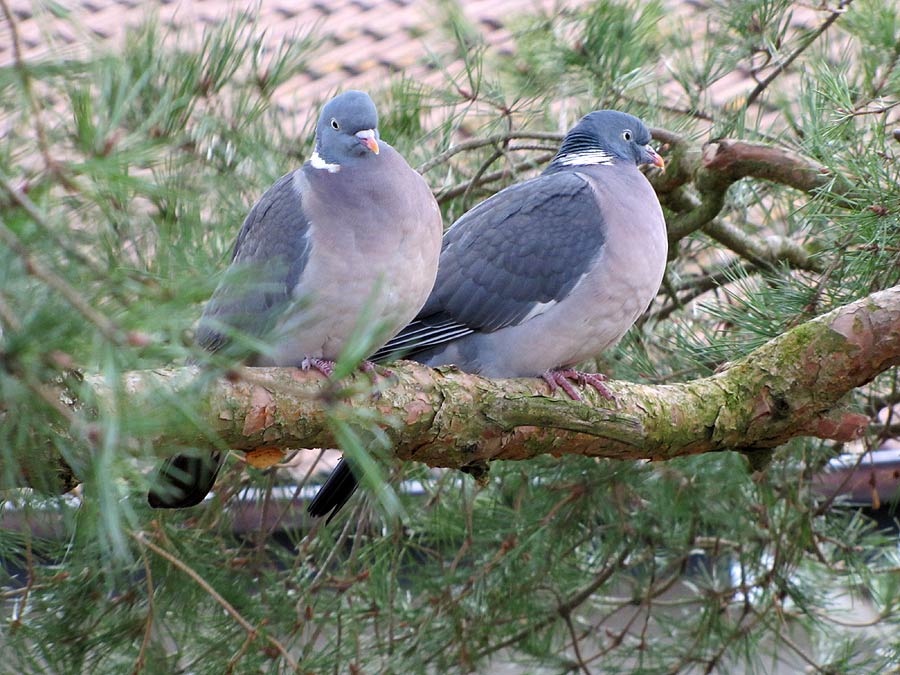 Hübsch sehen sie aus, wenn man sie so durchs Wohnzimmerfenster in der Kiefer sitzen und turteln sieht.