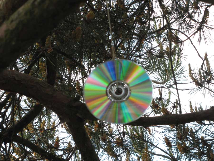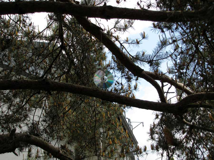 Schon öfter habe ich gesehen, dass DVDs auf Feldern und in Gemüsegärten der Vogelabwehr dienen. Also habe ich eine solche schillernde Scheibe im Baum aufgehängt, etwas höher und mit seitlichem Abstand zu dem bevorzugten Sitzplatz.