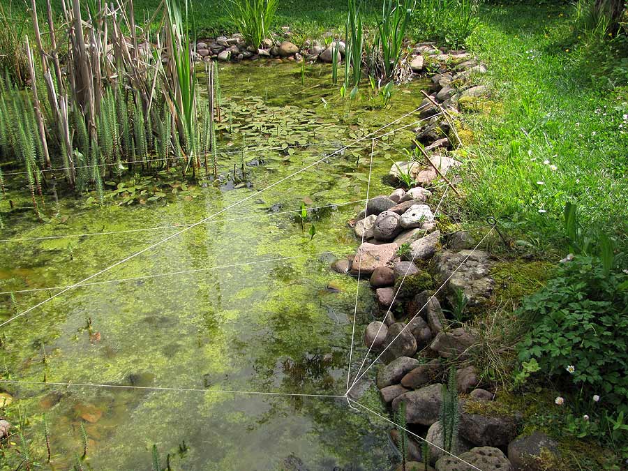 Auch da half ein „tierpsychologischer Trick“: Nicht ganz schön, aber wenigstens wirksam, habe ich dünne Bindfäden kreuz und quer über das Wasser gespannt.