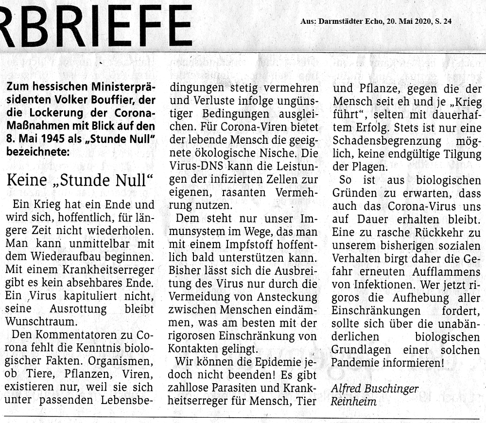 Gebracht hat's nichts, aber das habe ich auch nicht erwartet :roll:. Die jetzt einsetzenden Lockerungen des "Shutdown" und die zum Teil übermütigen bis fahrlässigen Verhaltensweisen unserer Mitbürger (aber auch in den USA und anderen Staaten) lassen das Schlimmste befürchten!