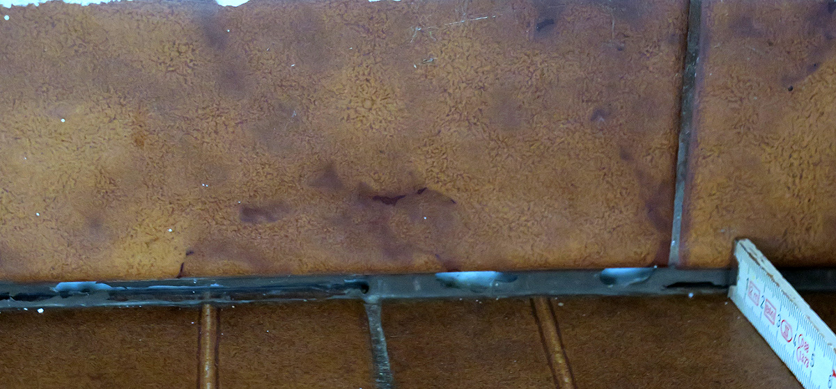 Jetzt wird‘s fürchterlich! Zwischen dem gefliesten Sockel und dem Boden ist eine Silikonfuge löcherig geworden! In den Löchern leuchtet der Blitz die vor Ankleben der Sockel-Fliesen weiß gemalte Wand aus. - Diese Fuge hatte ich in anderen Teilen der Küche bereits 2018 mühsam ausgebessert, allerdings nicht bis in den jetzt betroffenen Bereich. Die Küchenzeile abbauen? Nein! Die ist noch so gut wie neu! Und die würde man kaum wieder so gut aufbauen können.