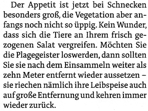 Wenn damit Nacktschnecken, insbesondere die berüchtigten Nacktschnecken (z. B. „Spanische Wegschnecke“) gemeint sein sollten, dürften die sich allenfalls totlachen. Bei mir im Garten half da nur schonungsloses Totmachen. Schließlich vermehren sich solche Tiere, und wenn sie das an einem guten Platz in der Nähe tun, breitet sich der Nachwuchs auch wieder in Richtung des ursprünglichen Gartens aus.
