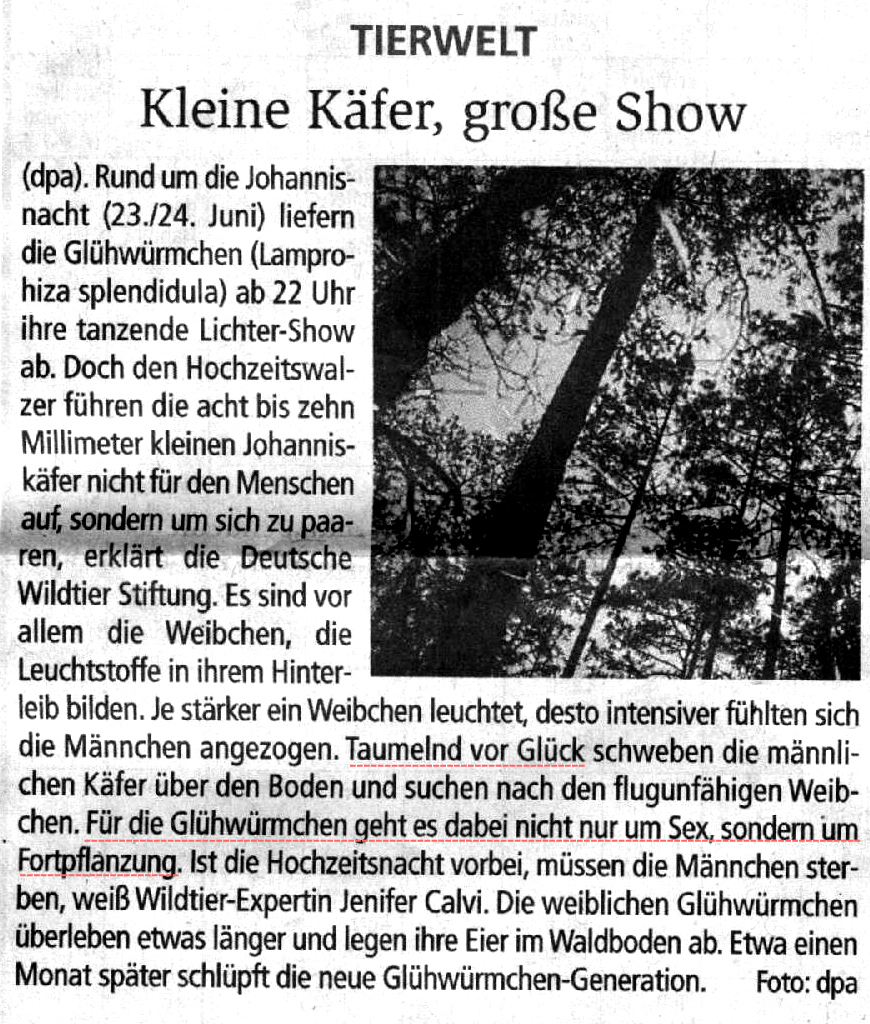 Taumelnd vor Glück schweben die männlichen Käfer über den Boden...“ - Was sollen sie denn sonst tun auf der Suche nach den Lichtsignalen der Weibchen am Boden? Und ob sie dabei „Glück“ empfinden?