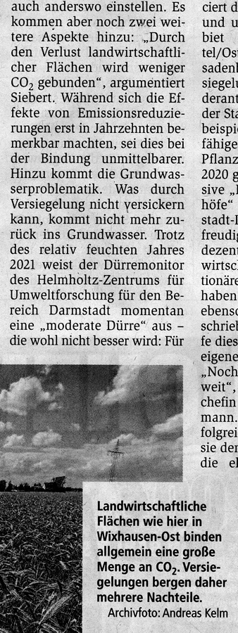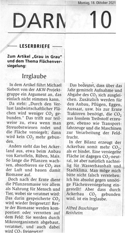 Kürzlich, am 7. Oktober 2021, hat unsere Tageszeitung (Darmstädter Echo) in einem großen Artikel („Grau in Grau“) über die Flächenversiegelung in Darmstadt berichtet. Darin steht viel Wahres. Aber es wird auch ein verbreiteter Irrtum kritiklos weiter verbreitet, nämlich dass Ackerland große Mengen an CO2 binden könne.