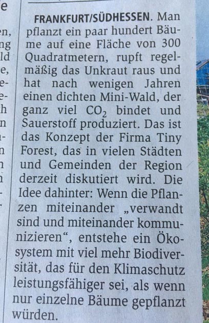 Auch in Darmstadt wurden und werden solche angelegt. Zur Information: https://permakulturblog.de/tiny-forest/ mit Bildern. Auch die Kommentare sind lesenswert!