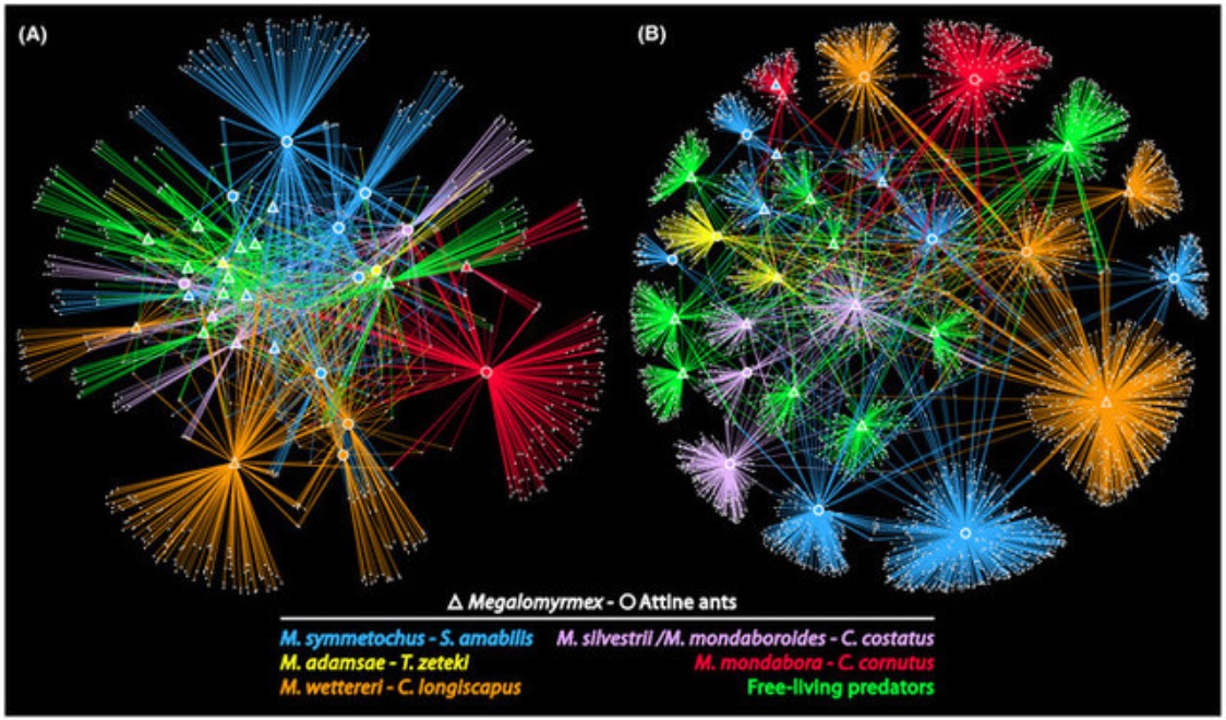Figure 1: Network analyses of ant microbiotas based on 97% operational taxonomic units (OTUs) (A) or unique sequences (B), with Megalomyrmex samples shown as triangles and attine host samples as circles. The six colours separate