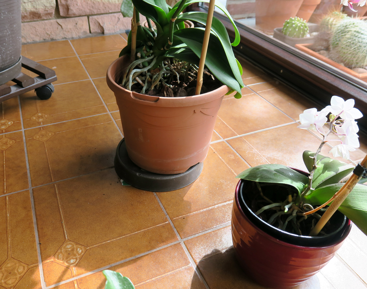 Dann wurde die Dose unter einen umgekehrten Blumentopf-Untersetzer platziert. Die Orchidee, die zuvor in dem Untersetzer stand, habe ich oben drauf gestellt;