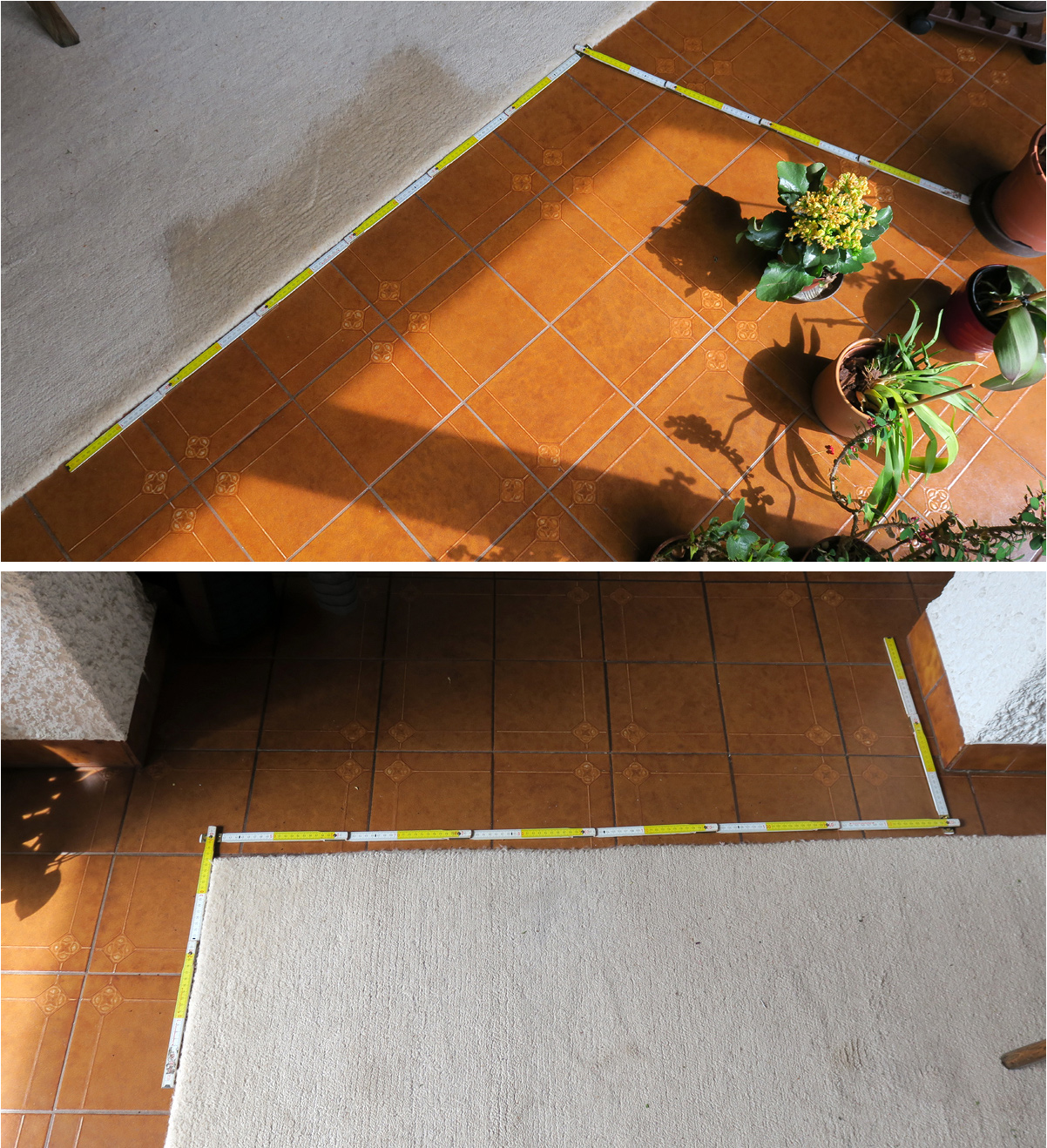 Oberes Teilbild: Die Ansicht von Köderstelle und Weg zum Teppich von oben (2 m); unteres Teilbild (aus anderem Blickwinkel): Immer schön der Teppichkante folgend zum Durchgang in die Küche (weitere 2 m). Die Tiere laufen wo möglich stets in Deckung!