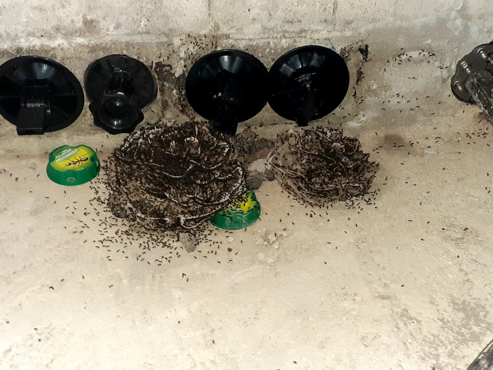 Ich gebe zu, dass auch meine Fantasie nicht ausgereicht hat, diese Bilder zu interpretieren! - Die schwarzen Verschlusskappen sitzen in der senkrechten Wand; die merkwürdigen Gebilde mit den Ameisen liegen am Betonboden, ebenso wie die beiden Köderdosen.