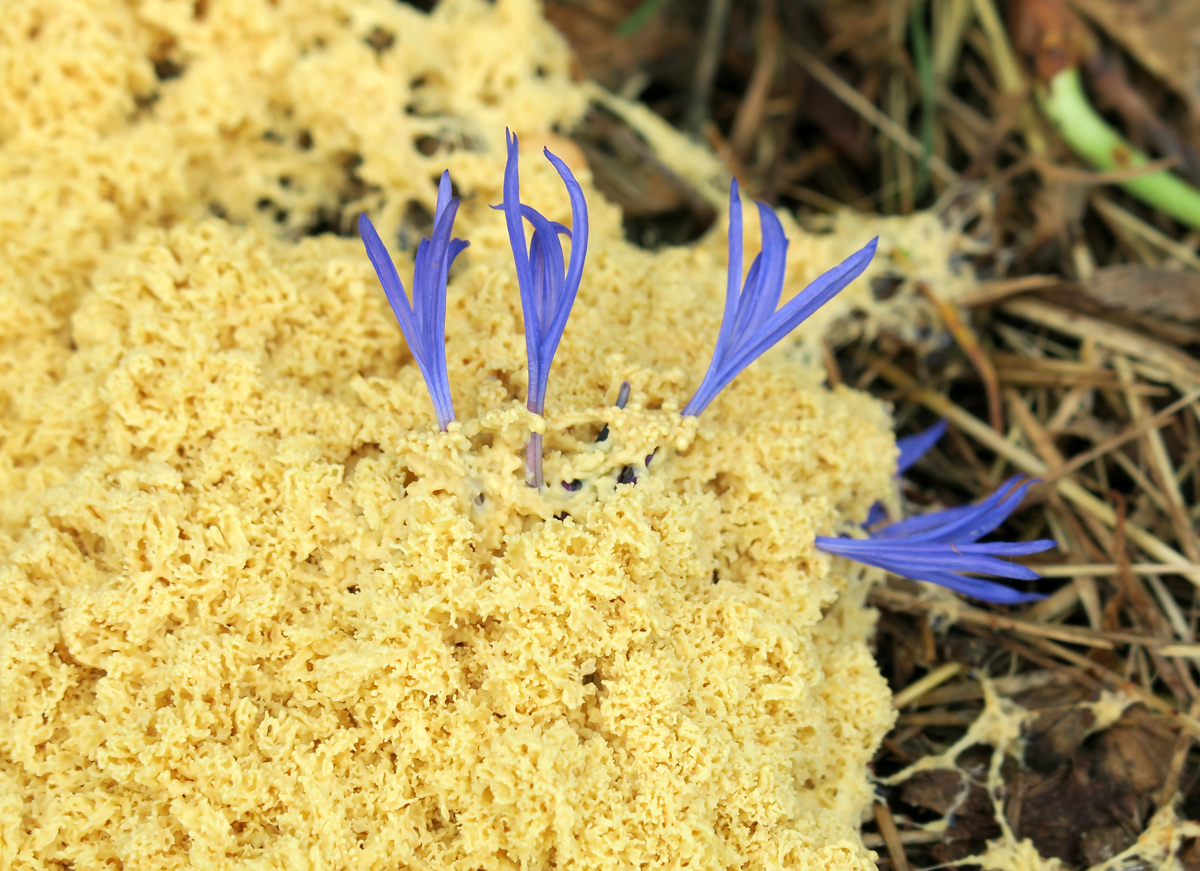 Das Rätselbild ist vom 14. Mai 2021; über Nacht war das Plasmodium über eine angewelkte Blüte der Bergflockenblume aus einem Blumenstrauß gewachsen.