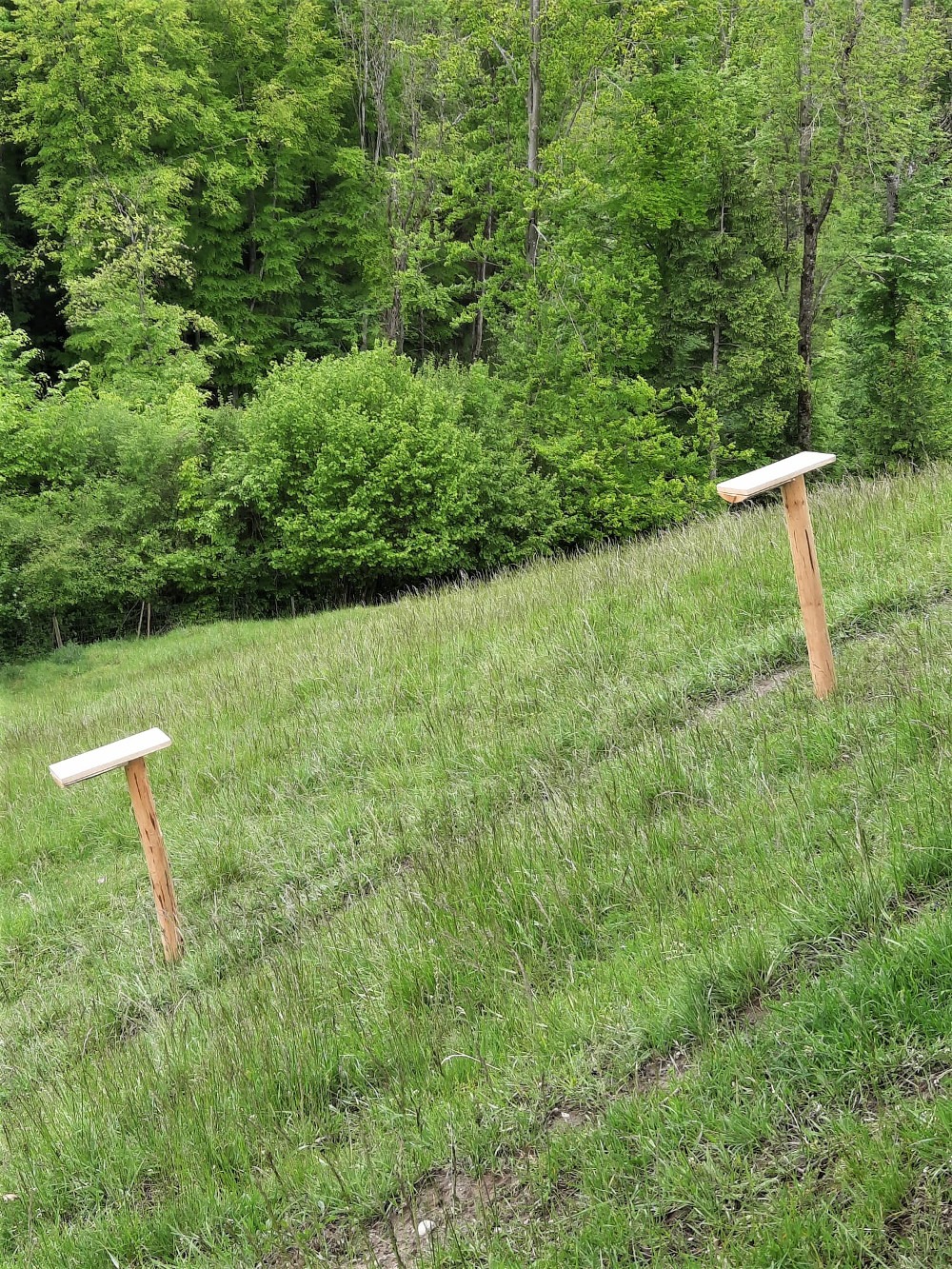 MBM, du hast voll ins Schwarze getroffen! Die Einrichtungen dienen als "Schwarmfänger" für Honigbienen. Die Pfosten, an deren Ende ein Brett mit einem Stück Rinde/Schwarte an der Unterseite angebracht sind, sind wenige Meter vor dem Stand in direkter Flugrichtung der Bienenbeuten aufgestellt.