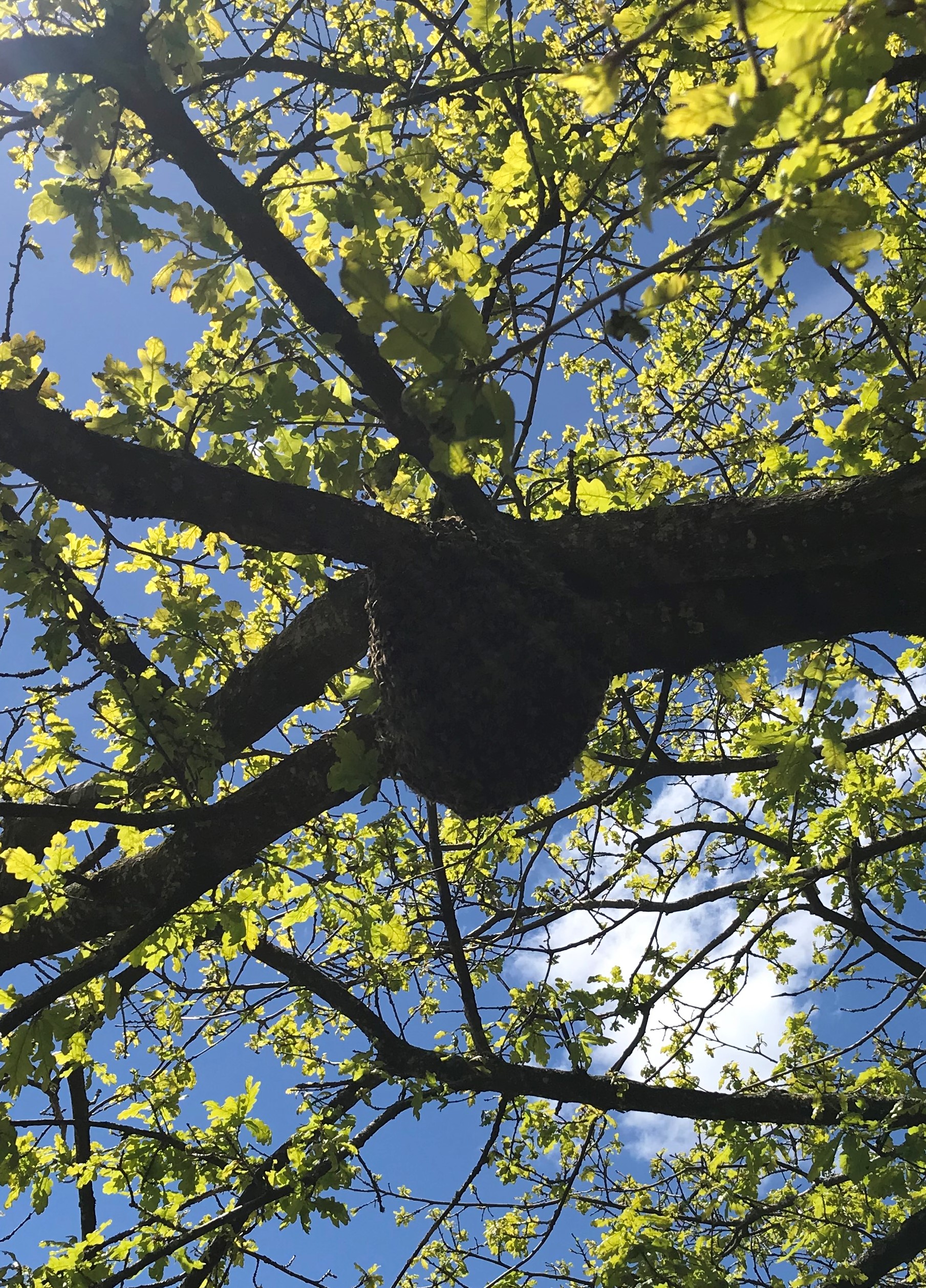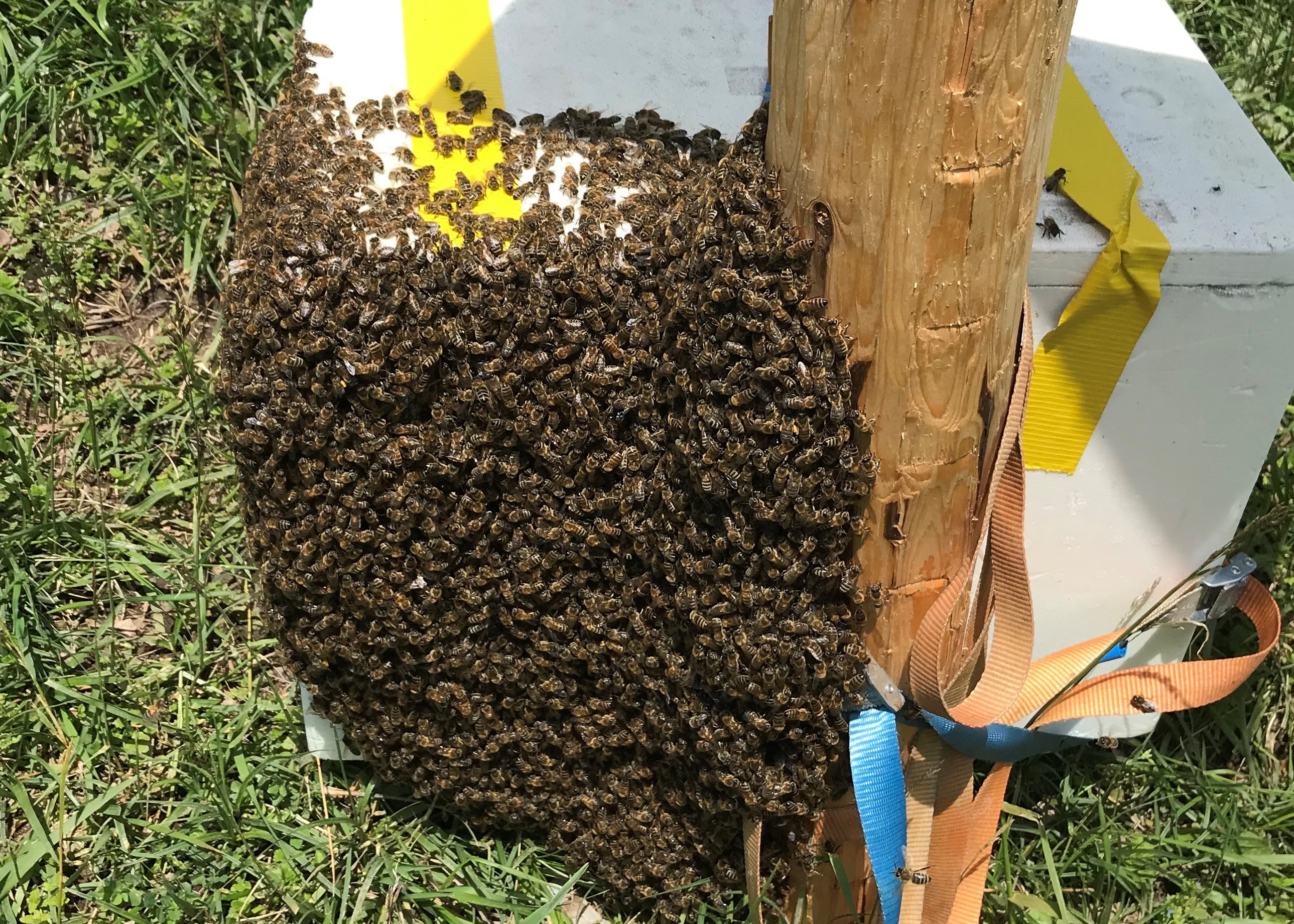 das ist sehr interessant. Tolles Rätsel, vielen Dank! Ich vermute, dass das nur zuverlässig funktioniert, wenn es keine anderen möglichen Sammelplätze (also breite Äste) im näheren Umkreis des Bienenstocks gibt?