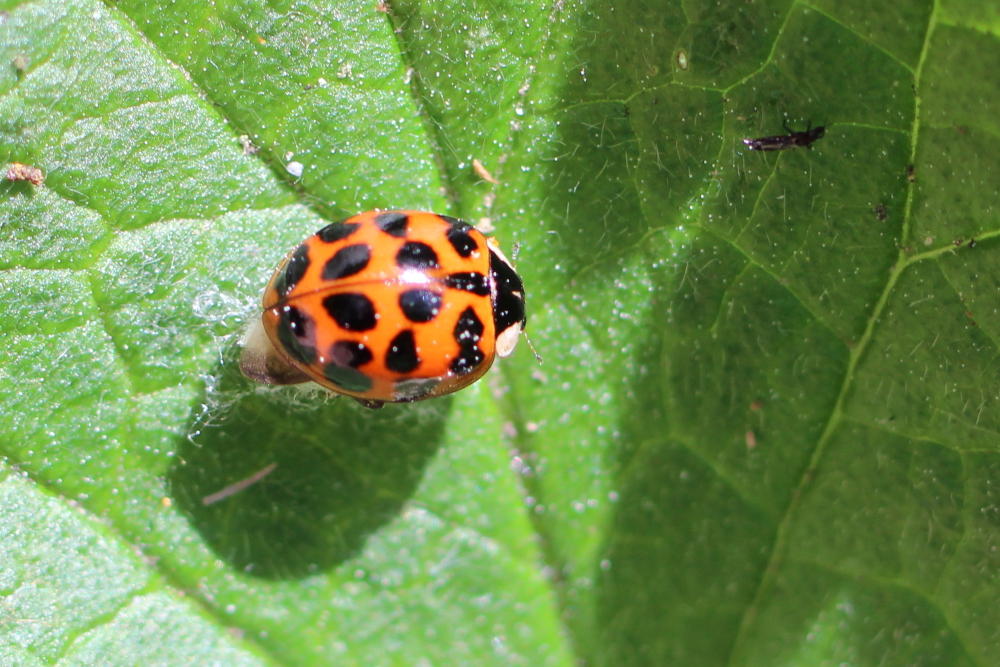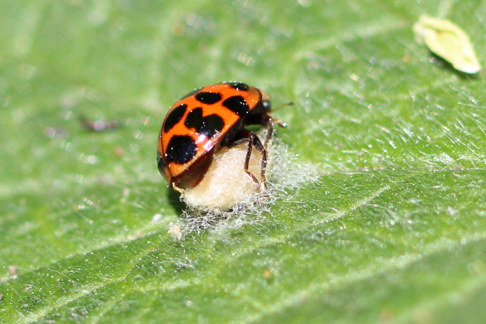 Versucht hier ein Marienkäfer eine Wolllaus trotz ihrer "Schutzschicht" zu fressen?