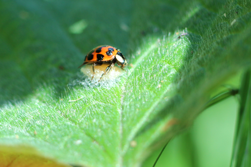Im Garten ausgesetzt, wird sie weitere sich ausbreitende Harmonia axyridis - Exemplare finden. Wegen parthenogenetischer Fortpflanzung ist die nächste Generation nahezu gesichert.