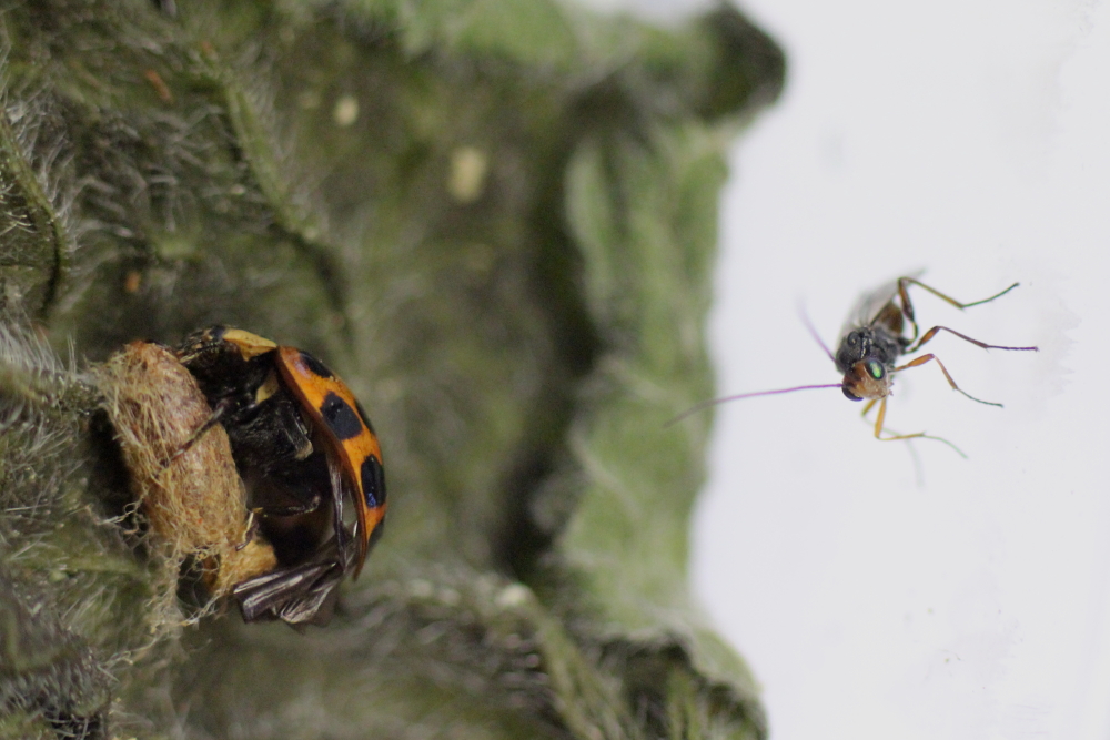 Die auf europäische Marienkäfer spezialisierte Wespe befalle angeblich nur selten den sich ausbreitenden Asiatischen Marienkäfer (Harmonia axyridis.