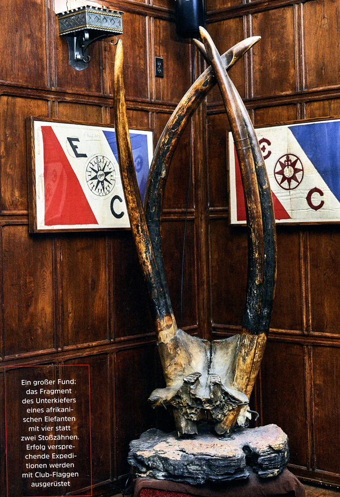 Es ist in einem Artikel enthalten, „Salon der Weltensammler“, aus einer Serie von GEO-Expeditionsreporter Lars Abromeit, „Abromeits Expeditionen“, wobei es hier um den etwas elitären „Explorers Club“ in New York geht. Im Hauptquartier des Clubs sind Sammlungsstücke aus aller Welt ausgestellt, darunter diese merkwürdige Missbildung eines Elefanten mit vier Stoßzähnen.