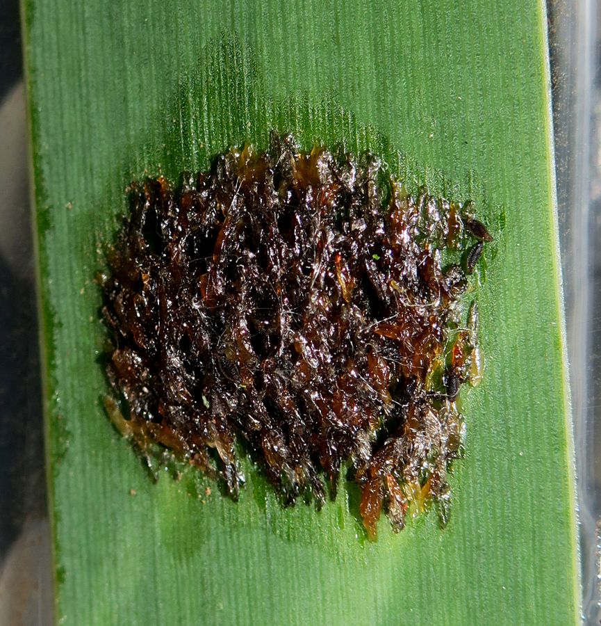 Es befindet sich seit 25. Aug. auf einem Blatt in meinem Garten. Ausschnitt aus einer noch größeren Fläche.
