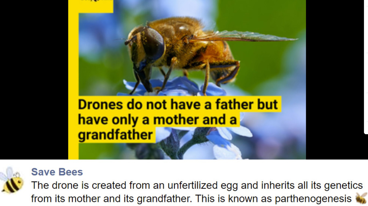 Der Drohn entsteht aus einem unbefruchteten Ei und erhält sein gesamtes Genom von seiner Mutter und seinem Großvater. Dies kennt man unter der Bezeichnung Parthenogenese.“ (unter dem Bild)
