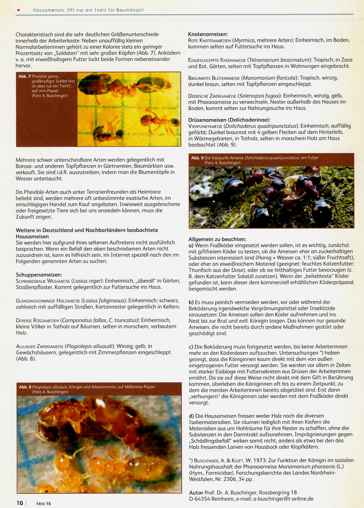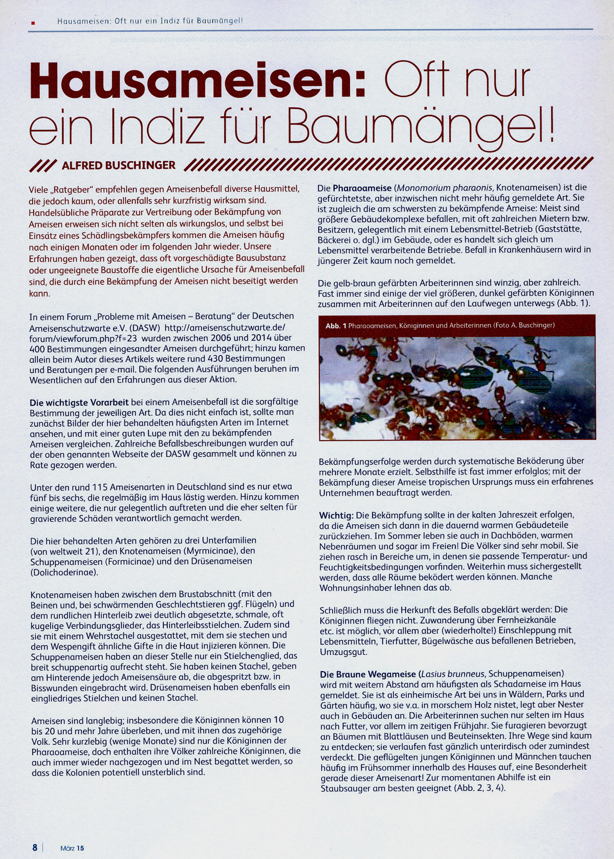 Höchst dankbar bin ich nur, dass man meinen Namen nicht genannt hat. Ärgerlich könnte es werden, wenn nun wieder zahlreiche Anfragen an die DASW gerichtet werden: Wir müssen die Betroffenen leider fast immer enttäuschen, denn auch wir kennen keine Möglichkeit, die Hausameisen auf einfache Weise „endgültig“ los zu werden.