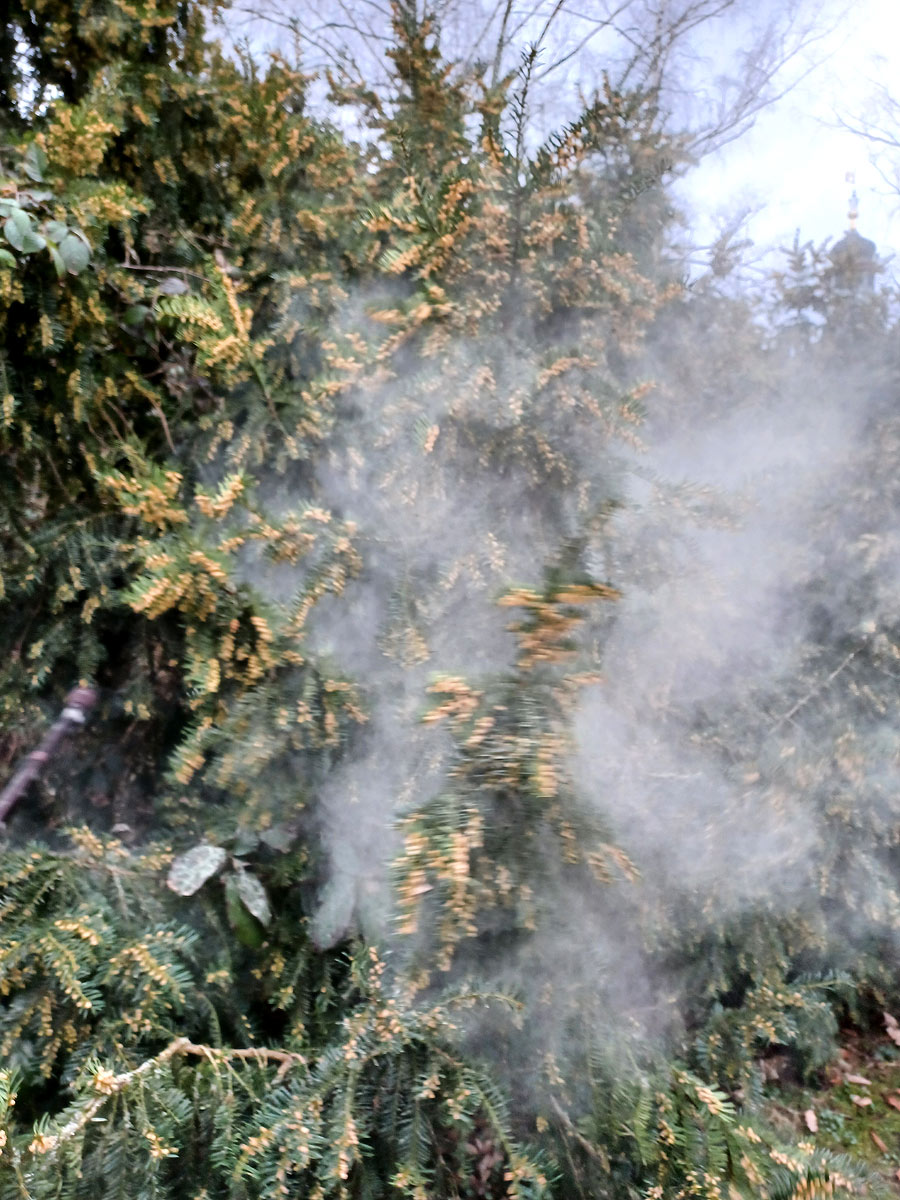 Ja, Pollenstaub von Eibe ist richtig! Gut bekannt ist ja das Stauben von Haselnuss-Kätzchen und von Kiefern, in beiden Fällen ist der Pollen gelb.