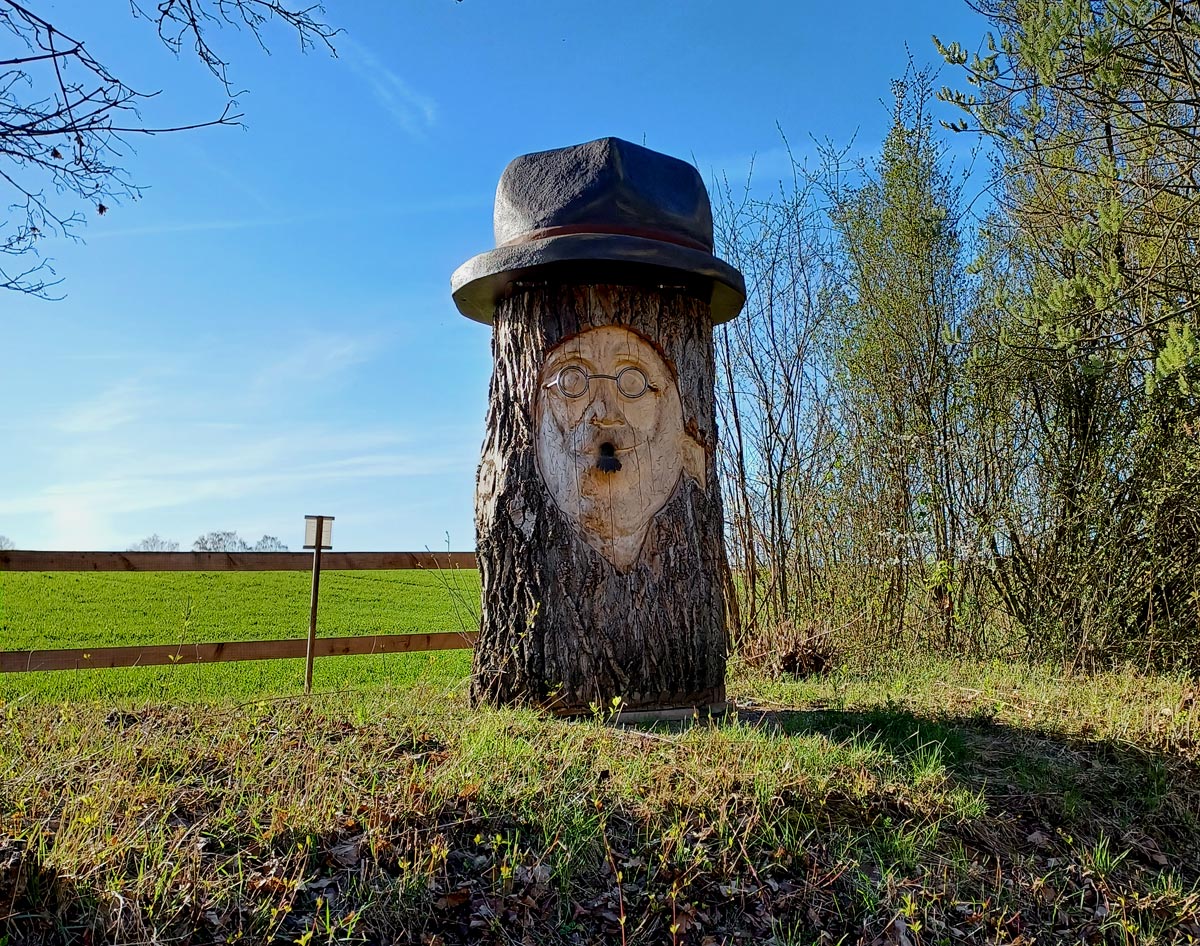Das dicke Stück Baumstamm enthält eine Bienen-Beute! Der "Mund" ist das Flugloch.