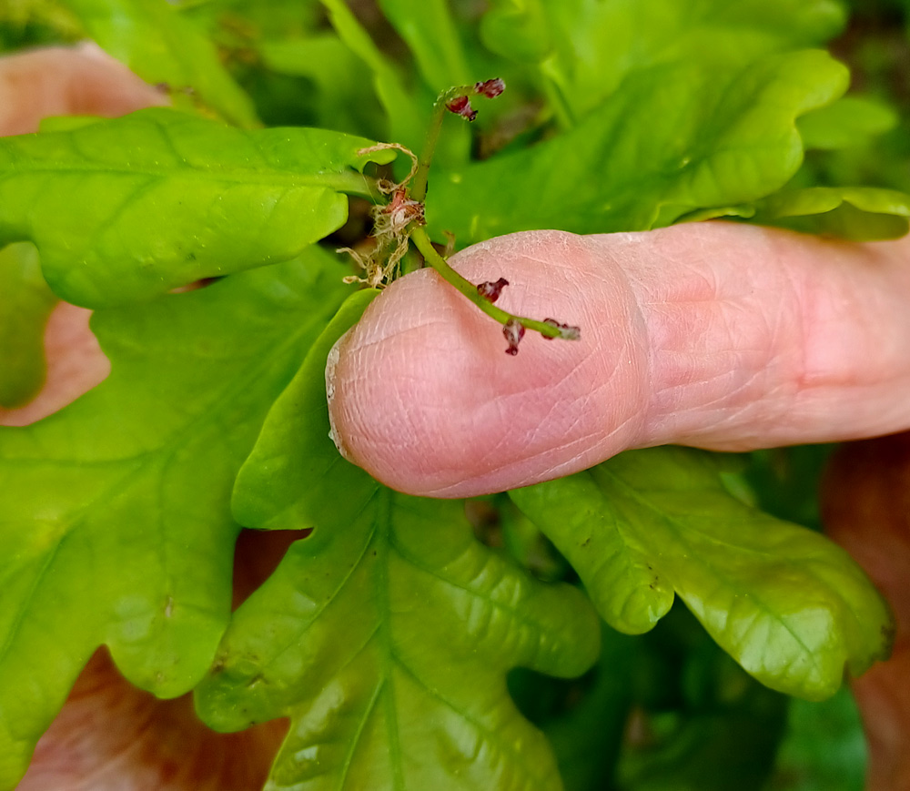 Bravo! Steffen Kraus hat Recht, es sind weibliche Blüten der Stieleiche Quercus robur. Früher hieß sie Q. pedunculata, was übersetzt "gestielt" heißt und sich darauf bezieht, dass die Eicheln und auch, wie auf dem Bild zu sehen, die weiblichen Blüten auf Stielchen sitzen. Die männlichen Blüten finden sich in Vielzahl an langen, gelblich-grünen "Kätzchen", auf demselben Baum. Im Gegensatz zu den winzigen weiblichen Blüten sind sie sehr auffällig.
