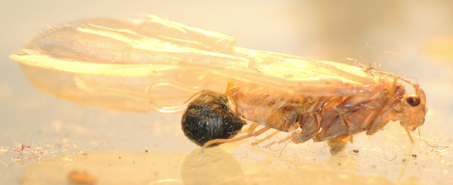 Habe dieses vertrocknete Insekt in einem alten verlasenenem Spinnennetz an einer Hauswand gefunden. Weiß jemand was dieses schwarze Gebilde ist das über einen Schlauch mit dem Abdomen des Insekts verbunden ist. Ohne Internet Recheche kann ich das Rätsel nicht lösen. Falls jemand schneller fündig wird oder sich auskennt, bitte um Antwort.