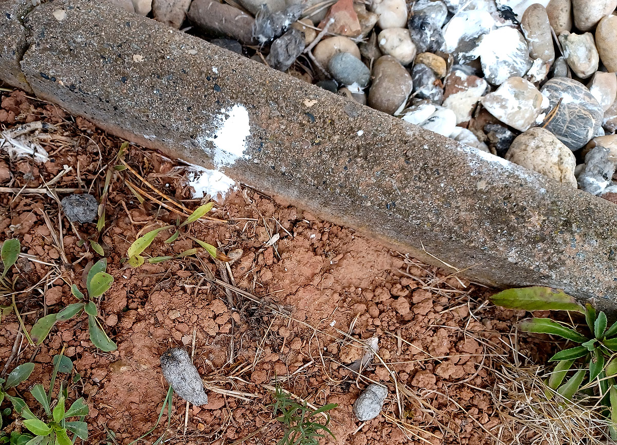 Vor den Betonplatten zum Garten liegen ein paar graue Klümpchen von etwa Fingerdicke. Das Bild ist von gestern, ich beobachte die Stelle aber schon seit ca. 2 Wochen.