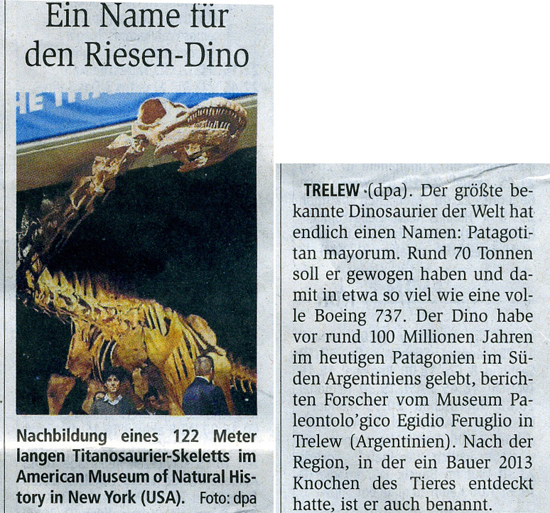 Anlass ist der Bericht über die wiss. Benennung eines Sauriers aus Patagonien. Die t-online-Nachrichten schreiben dazu: