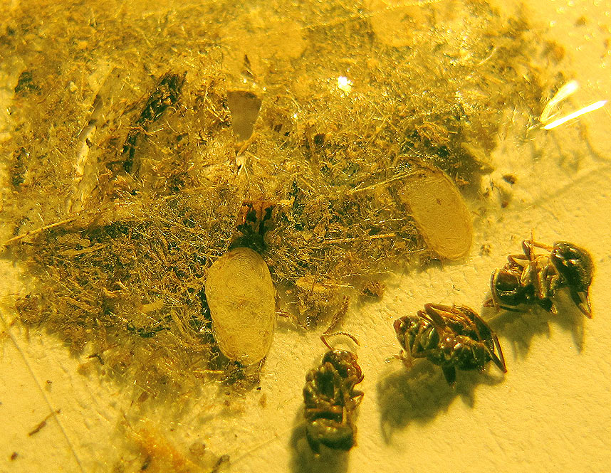 Es bleibt als Erklärung, dass ein Volk von L. niger zeitweilig in dem warmen, feuchten Isoliermaterial Puppen und wohl auch Larven gelagert hatte, vermutlich in der zu kühlen Zeit im Mai / Juni, vor der Hitzewelle. – Immerhin hatte ich so etwas bereits einmal beobachtet, als im Garten in einem Hornissenkasten (von Hornissen nicht angenommen,innen etwas feucht), ca. 3,5 m hoch im Baum, jede Menge Puppen von Lasius niger gelagert waren, betreut von Hunderten von Arbeiterinnen.