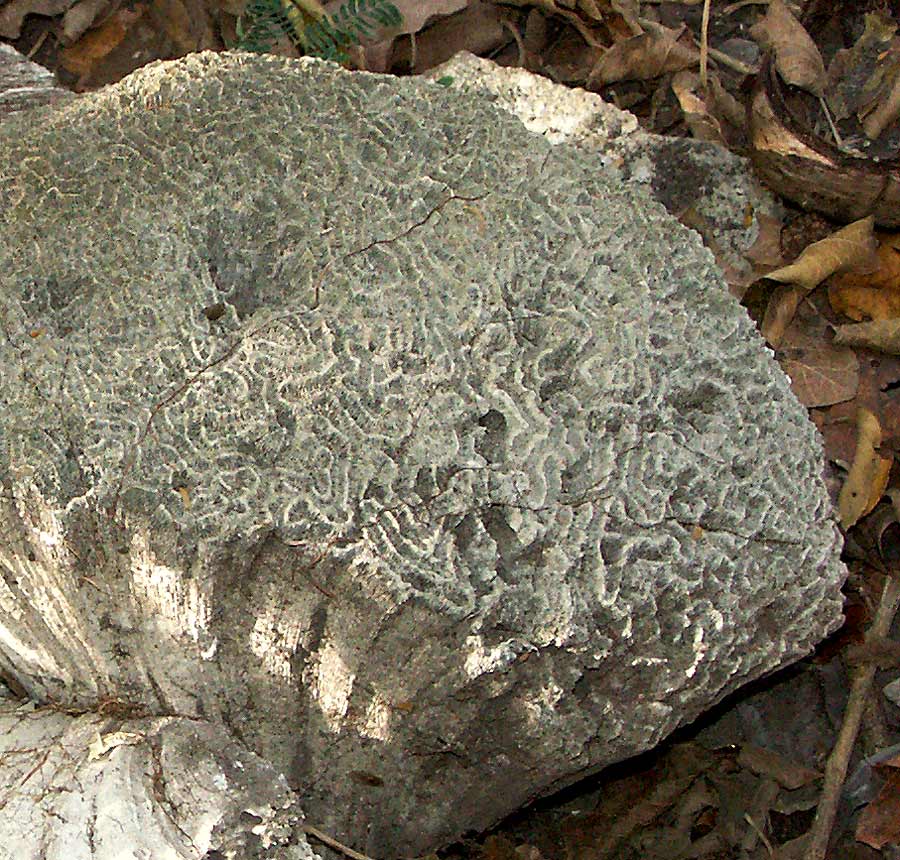 Entlang der Ostküste von Yucatan gibt es ausgedehnte Korallenriffe und berühmte Tauch- und Schnorchelreviere. Für meinen Fund kann man sich vorstellen, dass ein „Sammler“ das fußballgroße Stück vom Riff in den nahen Wald gebracht und dort zertrümmert hat: Kleine Stücke, natürlich in Meerwasser gelagert, lassen sich leichter durch den Zoll schmuggeln als der ganze große Brocken. (Nur ein Versuch der Deutung!)