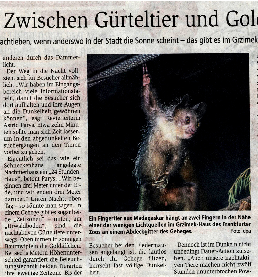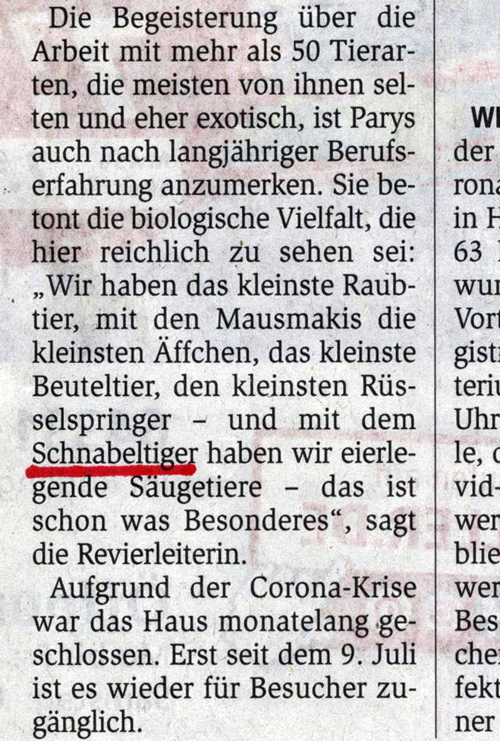 „Zwischen Gürteltier und Goldäffchen“ (Beitragstitel) wurde der wundersame Schnabeltiger im Grzimek-Haus des Frankfurter Zoos entdeckt.