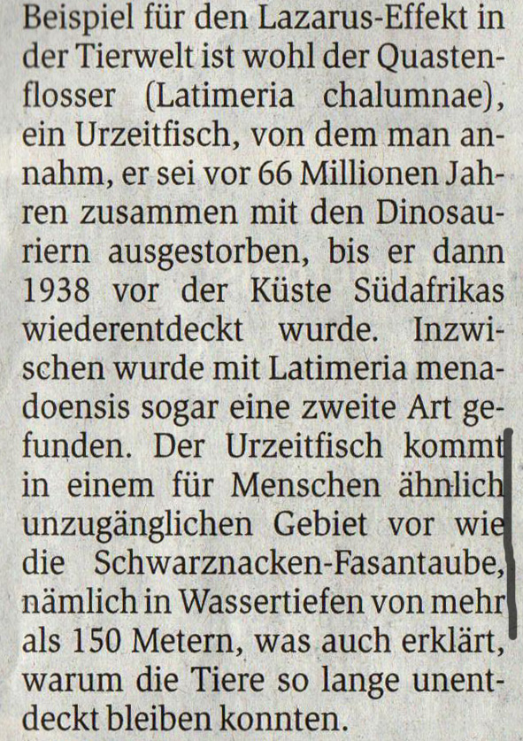 In unserer Tageszeitung, dem Darmstädter Echo, fand sich heute ein Artikel unter "Wissen", in dem es um Arten ging, die vor langer Zeit entdeckt und dann nicht mehr wieder gefunden wurden.