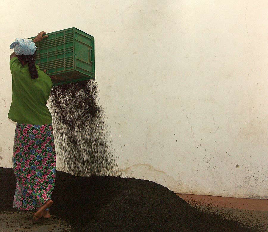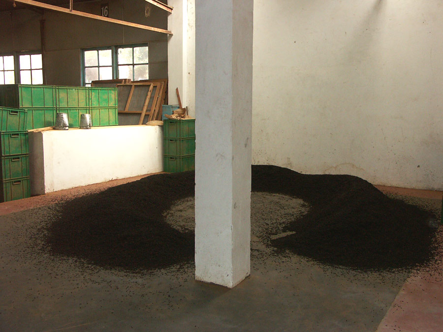 Fotografiert in einer Teefabrik.Was die Dame da im Kreis um sich herum schüttet (Bild), ist eine beim maschinellen Aussieben anfallende Fraktion, die wohl noch etwas nachtrocknen soll und dann zu einer schlichteren Teesorte weiter verarbeitet wird. - Es ist eine Wissenschaft für sich!