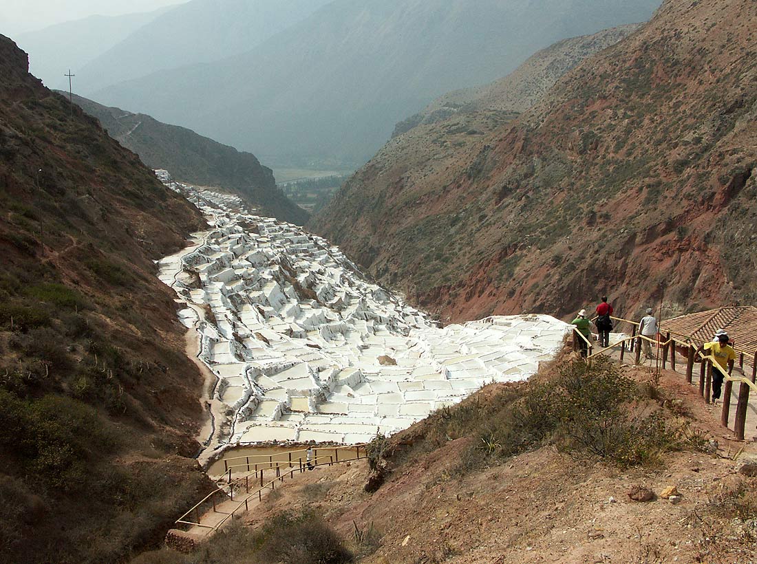 so dass man alles aus der Nähe inspizieren kann. Die Pisten oberhalb der Salzterrassen dienen dem Abtransport des Salzes, das In den Gebäuden rechts oben in Säcke abgefüllt wird.