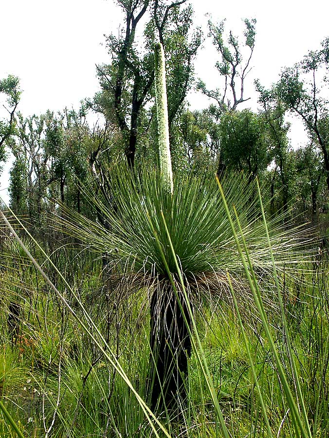 Es handelt sich um einen „Grasstree“ oder "Blackboy", Xanthorrhoea sp., Grasbaum, wovon es etliche Arten gibt. Die Gattung kommt nur in Australien vor (Endemit). "xantho- = gr. gelb; rhoe- = gr. Fluss, bezieht sich auf ein "Harz", das man aus einer der Arten gewinnt.
