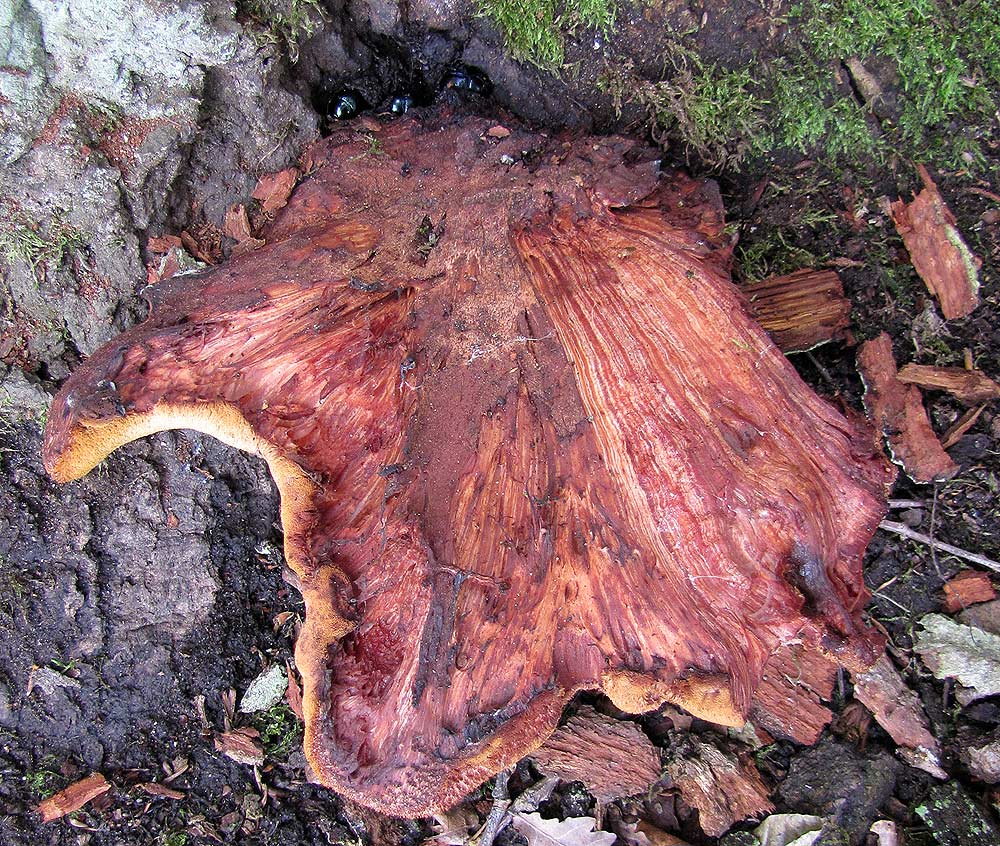 Ich habe ein jüngeres Exemplar angeschnitten um sicher zu gehen, und das abgeschnittene Stückchen fürs Foto neben den alten Pilz gelegt. Am unteren Rand ist das Sporenlager zu sehen, das hier aus dicht gepackten, aber einzeln stehenden Röhren besteht (Unterschied zu Röhrlingen!).