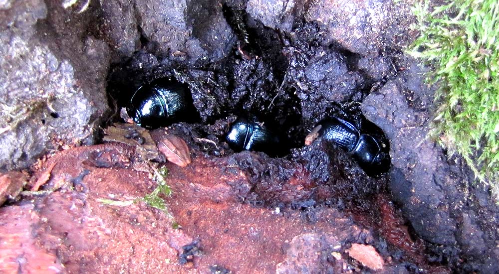 An der Basis dieses Exemplars sitzen wie „schwarze Diamanten“ drei Mistkäfer, die sich die Mahlzeit anscheinend schmecken lassen.