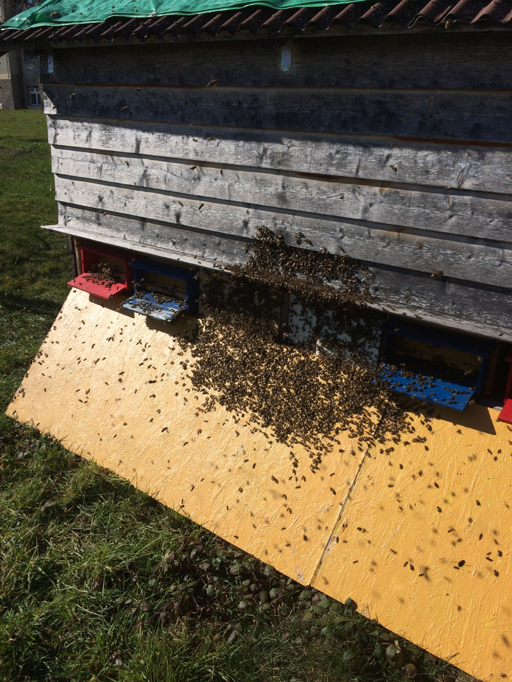 Im Bild zu sehen ist ein "abgewischtes" Volk, das versucht an seinen alten Stammplatz zurückzukehren, den Kasten aber nicht mehr findet. Die Bienen "betteln" sich in der Folge bei den Nachbarstaaten ein.