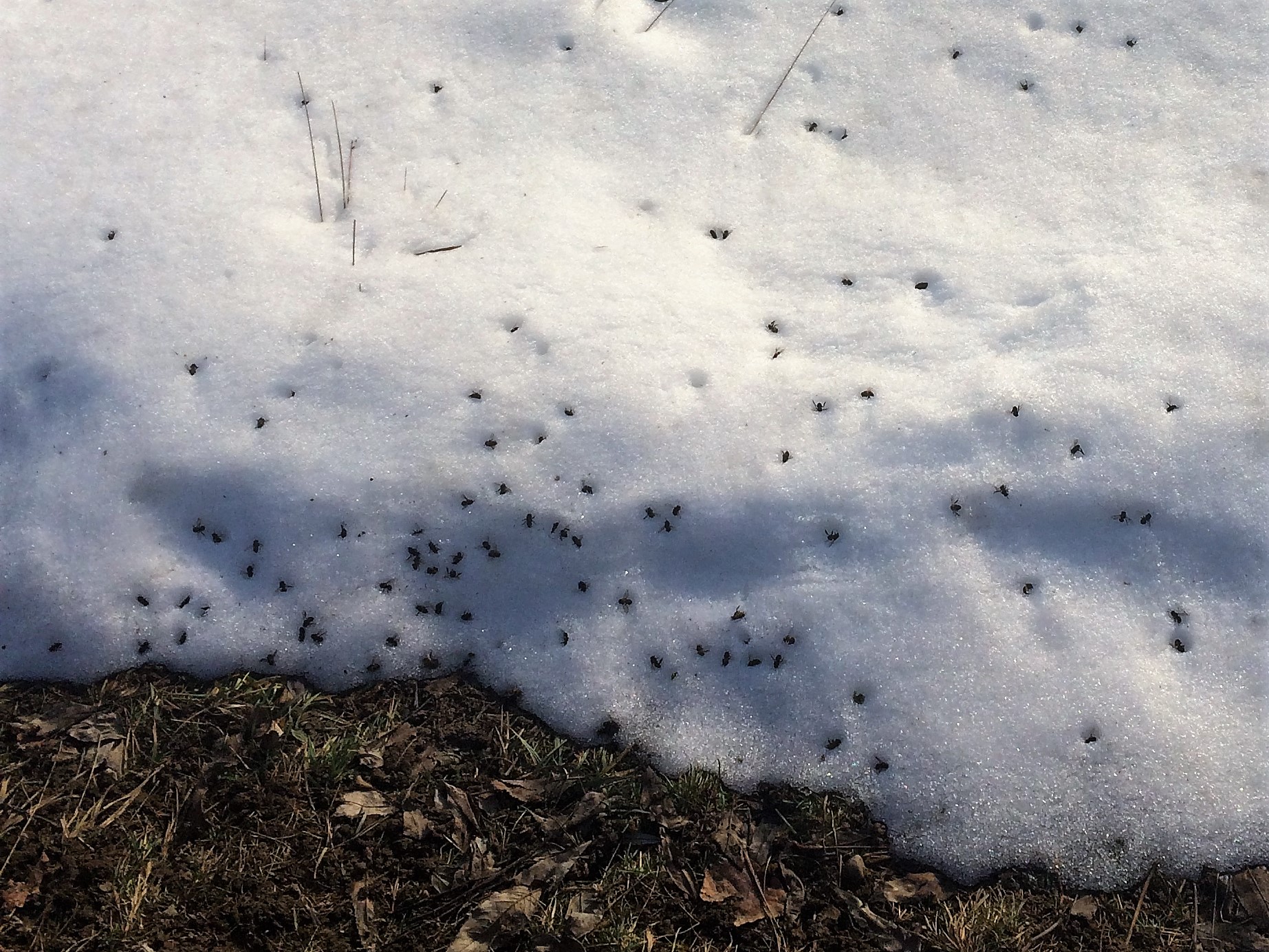 Es handelt sich um tote Honigbienen auf einer Restschneefläche etwa 1,5 m vor dem Bienenstand. Diese wurden von ihren Schwestern dort abgeworfen. Wie die meisten von euch wissen werden, machen die Honigbienen keine eigentliche Winterruhe in dem sie still bleiben und die Temperatur einfach aushalten. Sie stellen zwar das Brutgeschäft ein, bilden aber eine Wintertraube die sie beheizen, in dem sie zittern! Aussen ist die "Traube" ganz dicht, innen wird sie lockerer. Die aüssersten Bienen wechseln sich mit der Zeit ab. Nur die Königin bleibt immer in der Mitte, wo während des ganzen Winters eine Temperatur von leicht über 20°C herrscht. "Winterbienen" leben im Unterschied zu "Sommerbienen" fast 6 Monat und ernähren sich vom Honigvorrat. Stirbt allerdings eine Biene im Winter, fällt sie auf den Kastenboden. Dort wird sie erst im Frühjahr, während der sogenannten Reinigungsflüge entsorgt: Steig die Temperatur wieder über 10°C und scheint die Sonne, berechen die Bienen auf und entleeren ihre Kotblase, die sie im Stock während der Winterzeit nicht leeren (können).