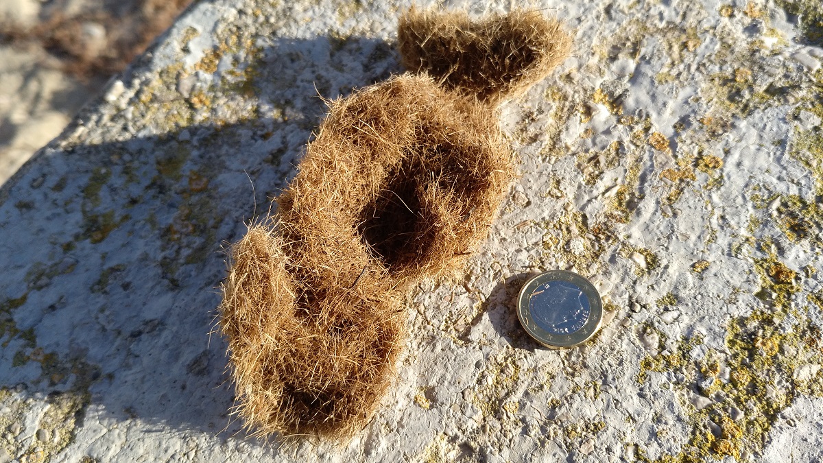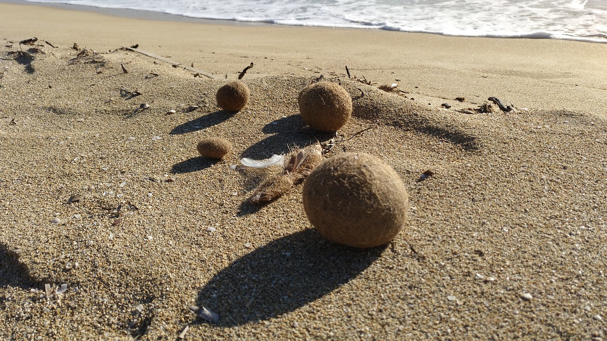 Hier am Strand gibt es sie bei der momentan stürmischen See in Massen zu bestaunen. Habe mal eine geöffnet, die Kugel besteht durch und durch aus abgestorbenen Blattfasern des Neptungrases [Posidonia oceanica], einer im Mittelmeer endemisch vorkommenden Pflanze.