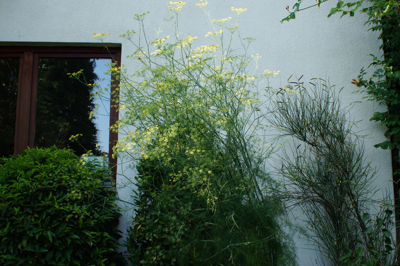 Es gibt die Möglichkeit Insekten anzulocken, im Garten zu beobachten und ihnen Nahrung anzubieten. Viele Insektenarten lieben die Doldenblütler, das ist allgemein bekannt. Die mit Abstand beste Pflanze ist hier der Fenchel, den ich seit über 10 Jahren am selben Ort halte. Ich verwende davon fast nichts und schon gar nicht den Wurzelknollen, der in der Küche Verwendung findet. Die Pflanze treibt jedes Jahr wieder aus und erreicht eine Höhe von etwa 3 m. Die Ökologie ist in unserer städtischen Gegend schon seit längerem ruiniert, aber am Fenchel finden sich Insekten ein, die man sonst nie sieht: Soziale und solitäre Bienen, soziale und solitäre Wespen, Fliegen, Wanzen usw. Ich übertreibe nicht, wenn ich sage, dass bei günstigem Wetter ständig zwischen 20 und 40 Insekten während der Blütezeit anwesend sind. Außerdem kann ich etwa jedes 2. Jahr auch Raupen vom Schwalbenschwanz entdecken. Zudem duftet die Pflanze gut und hat schöne (kleine) Blüten. Man muss sie nur anbinden, weil Gewitter oder Hagel die Pflanze umbrechen können.