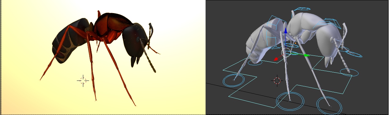 Links: Gerendertes Bild. Rechts: Modell mit armature