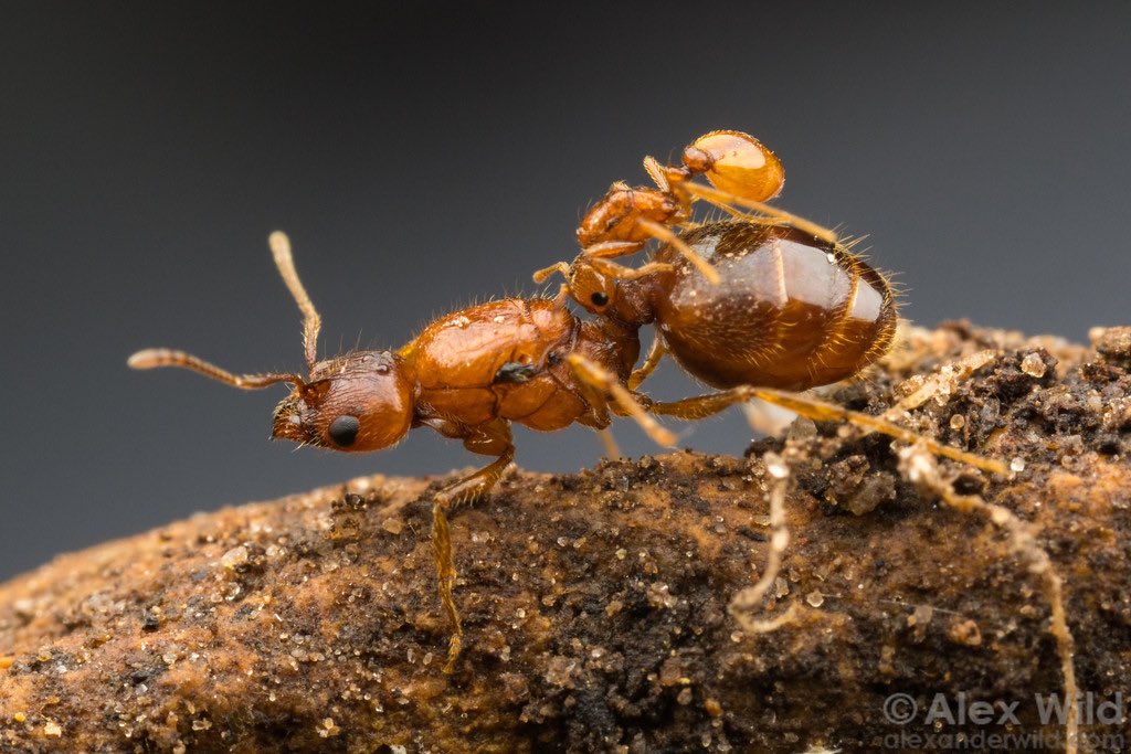 One of the oddest ants I’ve ever encountered is Solenopsis phoretica, a parasite which rides piggyback on queens of another genus, Pheidole. Found this one a couple days ago at Brackenridge Field Lab in Austin.” - (Eine der merkwürdigsten Ameisen, die mir je begegneten, ist