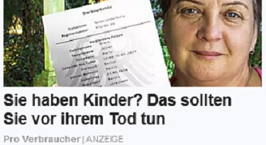 Ohne ein in der Anredeform groß geschriebenes „Ihrem“ steht da ein Hinweis auf das, was man vor dem Tod seiner Kinder tun sollte.