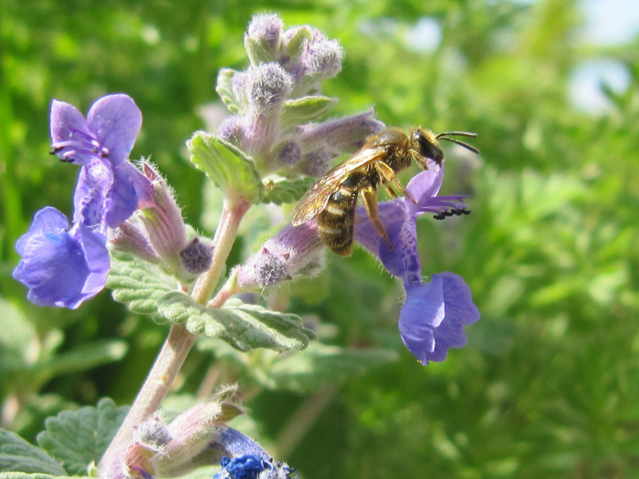 Auch bei mir war heute bei ca. 15°C im Schatten, aber überall schönstem Sonnenschein, allerlei Hautflügler unterwegs. Nesbst zwei verschiedenen Hummelköniginnen, konnte ich auch die ersten Männchen der Rostroten Mauerbiene Osmia cornuta, sowie Feldwespenköniginnen von Polistes dominula und Männchen der Blauschwarzen Holzbiene Xylocopa sp. beobachten Hier eine weiter Wildbiene, die ich ablichten konnte, vermutlich eine Furchenbiene der Gattung cf. Halictus sp. Lasioglossum sp.