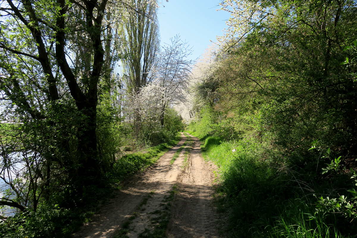 Rechts ist ein Damm der Odenwaldbahn, südexponiert und mit herrlich blühenden Kirschen bestanden. Mehrere Schmetterlingsarten flogen da;