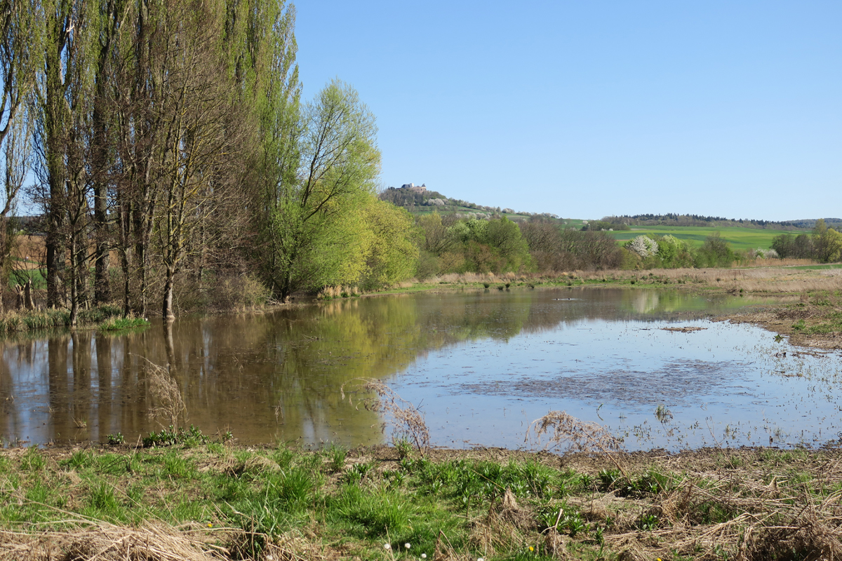Die Pappelreihe kennzeichnet den Verlauf der Semme, eines Baches, den die Biber aufgestaut haben. Im Hintergrund die weithin sichtbare Burg Otzberg.