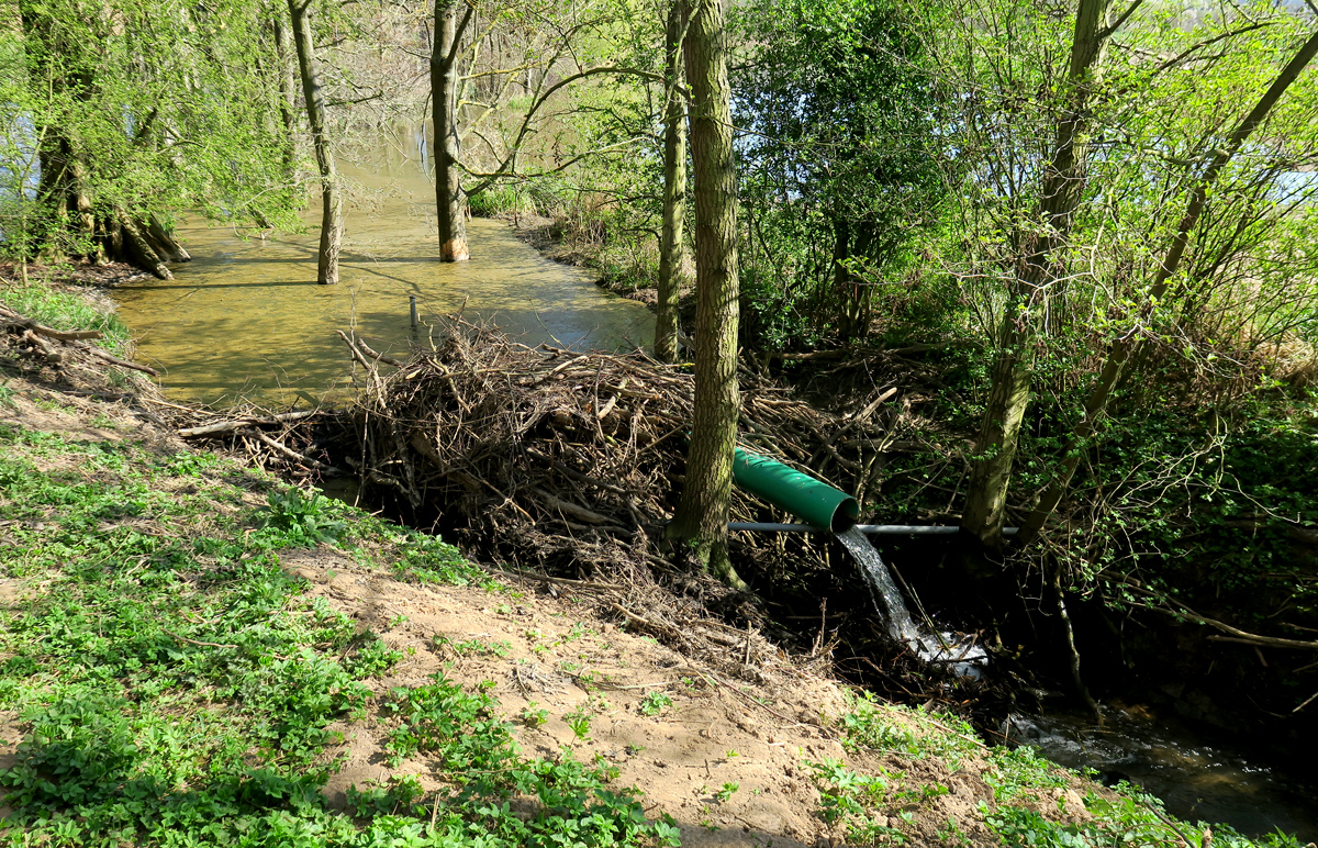 das grüne Rohr hindurch geschoben, so dass ein Teil des angestauten Wassers ablaufen kann. - Man darf gespannt sein, ob die Biber sich das bieten lassen!