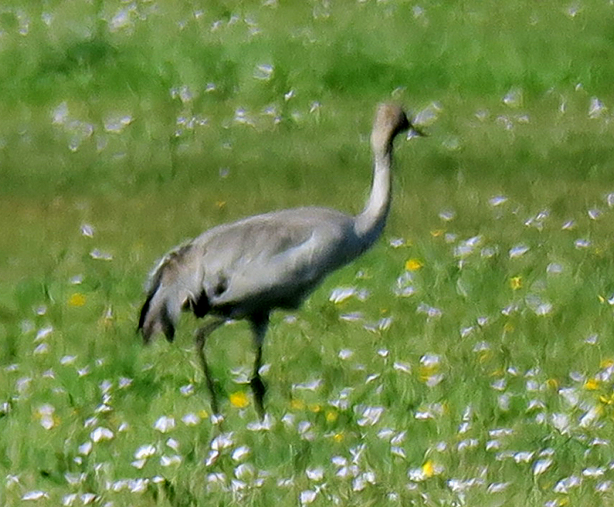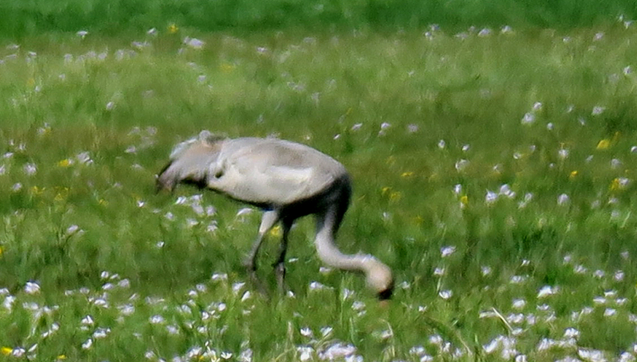 Doch halt! Das hinten abfallende Schwanzgefieder ließ bei genauerem Hinsehen keinen Zweifel: Das ist doch ein Grauer Kranich!